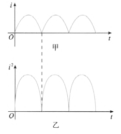 正弦式交变电流经全波整流后,其波形图如图 3–9 甲所示;瞬时电流的二次方 i2(t)的图像如图 3–9 乙所示。全波整流后,电流的方均根值应与整流前相同,故 I = \(\frac{{{I_{\rm{m}}}}}{{\sqrt 2 }}\) 仍然适用。
