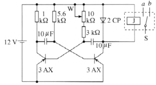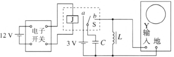 用示波器代替指针式电表能直接显示振荡的图像,并且因为示波管中电子的惯性极小,可以显示高频率的振荡电流,从而避免使用大电感演示。实验电路如图 4–10 所示,L 为 J2425 型变压器原理说明器的 400 匝线圈或 J2423 型可拆变压器的 800 匝线圈,套在闭合铁芯上,电感仅几亨,C 为 2μF 电容器。虚线框内为 J2466 型无线电组合教具中的电磁继电器,J 是它内部电磁铁线圈,用继电器的接点来控制 C 的充、放电。“电子开关”是无线电组合教具中的一个组件,是一个晶体管自激多谐振荡器,有的产品中无此组件,可用有关零件按图 4–11 所示电路组成。接通 12 V 电源,电子开关工作,线圈 J 中通过矩形脉冲电流,使继电器的动接点 S 按一定频率在静接点 a、b 间反复转换。J2458 型教学示波器的输入耦合开关置于“DC”,Y 轴衰减置于“×100”挡,X 轴扫描频率10 ~ 100 Hz,仔细调节扫描微调旋钮,使扫描频率恰好等于继电器动接点转换频率时,就可看到稳定的阻尼振荡的电压–时间图像。再调 Y 增益和 X 增益使图像有适当的幅度和横向展开。为使图像有典型性,应显示出 3 ~ 5 个周期的波形,所以要适当搭配 L、C 值,使电磁振荡的频率是继电器转换频率的 6 ~ 8 倍。对于图 4–11,可以调节电位器 W 改变电子开关所产生的矩形脉冲频率从而改变继电器转换的频率。