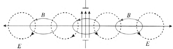 我们设想在空间某处有一个电磁振荡源,如它是一个交变的电场,它在自己周围激发磁场(图 4–5 中的实线椭圆圈),由于这个磁场也是交变的,它又在自己周围激发感应电场(图 4–5 中的虚线圆圈)。这样交变的感应电场和磁场相互激发,闭合的电场线和磁感线就像链条环节一样,一个一个地套连下去,在空间传播开,形成电磁波。图 4–5 只是电磁振荡在一个方向上传播的示意图,并非真实的电场线和磁感线的分布图。