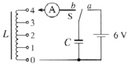 J 2434 型电磁振荡演示仪能达到上述要求。它所附的阻尼振荡示教板电路如图 4–9 所示,L 为特制的有抽头大电感线圈,接 1 ~ 4 时电感大于 500 H,电阻小于 50 Ω,C 为 200 μF 金属化纸介电容器,A 为仪器所附的灵敏电流表,内部接有阻值适当的阻尼电阻,表盘刻度零点左右各 30 格。实验时开关 S 先接 a 再扳向 b,可看到表针同零点左右摆动,周期约 2 s,振幅逐渐衰减,振荡 5 个周期后振幅衰减到 1 格以下。如 C 用电解电容器,反向漏电较严重,加快了能量损耗,振荡持续的时间将变短。