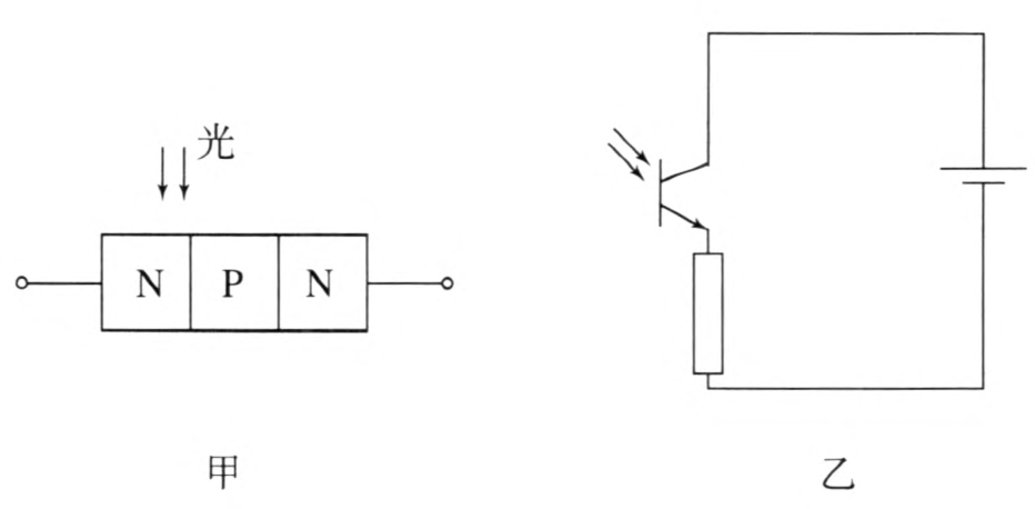 光电晶体管与一般晶体管很相似,具有两个 PN 结,只是它的发射极一边做得很大,以扩大光的照射面积。图 5–12 为 NPN 型光电晶体管的结构简图和基本电路。大多数光电晶体管的基极