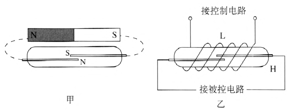 如图 5–13 乙所示,如果将干簧管 H 放入一个螺线管 L 中,两者就组合成为干簧继电器。当螺线管中通入电流时,电流产生的磁场就使干簧管中簧片被磁化而吸合。干簧继电器的优点是体积小、重量轻、灵敏(螺线管匝数很多时,通入几毫安的电流就能使簧片吸合)、簧片能够快速动作、触点的寿命长。