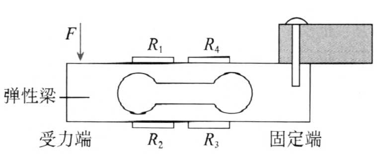 在梁形的弹性构件上下两个表面上各粘贴两个应变片,要将其中 R1、R4 两个应变片粘贴在梁的上表面,R2、R3 两个应变片粘贴在梁的下表面,如图 5–14 所示。