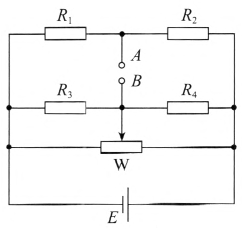 测量电路如图 5–15 所示,由这四个应变片组成电桥的四个桥臂,A、B 端接入数字式电压表。理论上要求四个应变片的电阻值相等,实际上必然存在制造误差,因此还要接入电位器 W,在梁不受力时,调节 W 使电桥的输出电压 UAB = 0。当梁受力 F 向下弯曲时,R1、R4 的阻值变大,R3、R3 的阻值变小,于是电桥失去平衡,A、B 端之间就输出与所测的力成正比的电压。