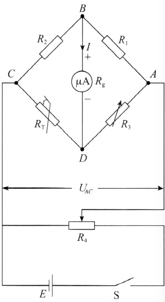 电路如图 5–16 所示。这是一个典型的不平衡电桥。按图连接电路,电流表的量程为 0 ~ 200 μA,内阻约 500 Ω。RT 为热敏电阻,常温下(20 ℃)阻值约 330 Ω,R1、R2 各为 270 Ω 的电阻,R3 为电阻箱,R4 为 50 Ω 的变阻器。E 为一节干电池。