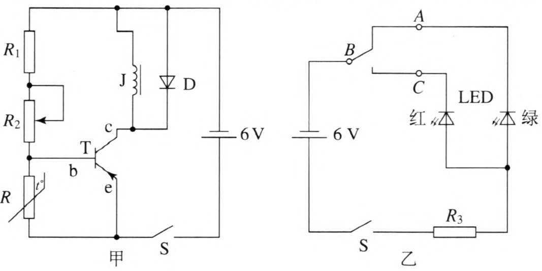 实验电路如图 5–17 所示。甲图中 T 为 3AX31 型三极管;J 为型号 2414 的直流继电器线圈,它的额定电压为 6 V,R1 为 1 kΩ 的定值电阻,R2 为 10 kΩ 的电位器(因实验室有现成的,实际使用小于 10 kΩ);R 为热敏电阻,标值 100 Ω(如果气温超 30 ℃,实测电阻小于100 Ω),从它的两个引脚各焊出一根细长的软导线;D 为 1N4001 型二极管,用它保护三极管,防止当线圈中电流急剧减少时产生的自感电动势把三极管的集电结击穿。乙图为被继电器触点控制的电路,A、B、C 分别为继电器的常闭触点、动触点、常开触点,LED 为发光二极管,一只红色,另一只绿色;电阻 R3 为 470 Ω,作为发光二极管的限流保护。现用它模拟一个电热箱的控制电路。