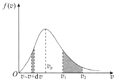 设处于热平衡态下某气体的分子总数为 N,速率分布在 v ~ v + dv 的分子数为 dN,则速率分布在 v ~ v + dv 的分子数占总分子数的比率 \(\frac{{{\rm{d}}N}}{N}\) 应与 v 有关,并且与 dv 成正比。设 \(\frac{{{\rm{d}}N}}{N}\) 与 v 之间的函数关系为 f(v),则 \(\frac{{{\rm{d}}N}}{N}\) = f(v)dv。如果求 v1 ~ v2 的分子数 ΔN,应有 \(\frac{{\Delta N}}{N}\) = \(\int_{{v_1}}^{{v_2}} {f(v){\rm{d}}v} \)。如果对所有速率的分子求积分,即 v1 = 0,v2 = ∞,则应有 ΔN = N,\(\int_0^\infty {f(v){\rm{d}}v} \) = 1。式中 f(v)称为速率分布函数。如果确定了函数 f(v),也就确定了气体分子按速率分布的规律。