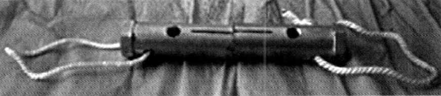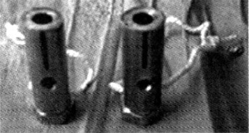 实验时,铅柱的端面用刨刀刨平。刨平端面后将两个铅柱侧面的红线对齐,如图 1–14 所示。然后将两个铅柱放到支架上,用螺旋压紧(图 1–15),再将铅柱吊挂在支架上。一般情况可以挂几千克的重物。
