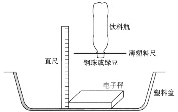 【实验器材】电子秤,直径 3 mm 的钢珠(或绿豆),塑料饮料瓶,薄塑料尺,塑料盆,秒表,直尺。