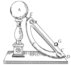 (3)大约在 1570 年,意大利有一位教授叫泰斯尼尔斯,提出用磁石的吸力可以实现永动机,名叫磁力永动机。他的设计如图 3–6 所示,A 是一个磁石,铁球 G 从 C 处受磁石吸引可沿斜面滚上去,滚到上端的 E 处,从小洞 B 处落下,经曲面 BFC 返回,复又被磁石吸引,铁球就可以沿螺旋途径连续运动下去。大概他那时不知道磁力大小是与距离的二次方成反比变化的,只要认真想一想,其荒谬处就一目了然了。