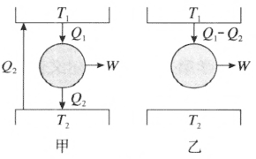 证明:(反证法)如果克劳修斯表述不成立,则热量能从低温热库自动地传到高温热库。因而可以设计一种热机,工作于这两个热库之间,其工作情况如图 3–7 甲所示。T1 为高温热库,T2 低温热库。我们从高温热库吸热 Q1,向低温热库放热 Q2,同时对外做功 W。我们使 Q2 自动地从低温热库传到高温热库。经过一个循环后,总的效果是从高温热库 T1 吸取热量 Q1 – Q2,对外做功 Q1 – Q2,低温热库状态不变。这相当于是一台从单一热库吸取热量对外做功的机器,即如图 3–7 乙表示,因而违背了开尔文表述。所以如果克劳修斯表述不成立,则开尔文表述也不成立。