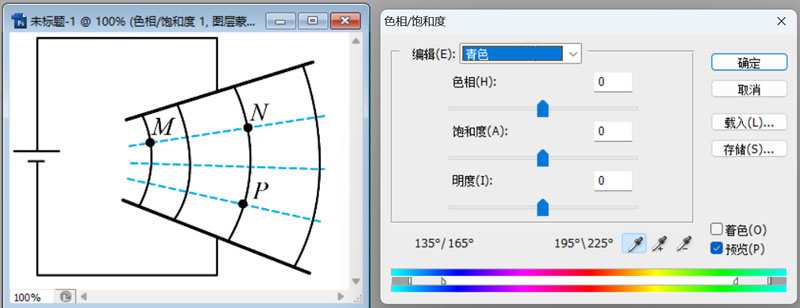 - 将“明度”滑块拉到最左边(-100):这会将上一步得到的灰色变为黑色。