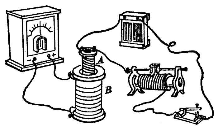 首先查明电流表指针的偏转方向和螺线管中电流方向的关系,然后把蓄电池(或其他低压电源)、开关和螺线管 A 串联成一个电路,把电流表和螺线管 B 串联成另一个电路。