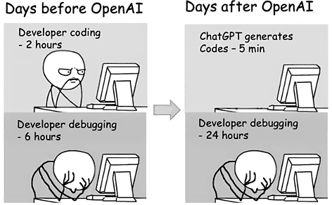 有了AI,直接提问就能直奔主题,甚至还会补充更多的细节,问题得到即时反馈,效率非常高,并不像下图的右边所示——AI生成5分钟,人工调试除错 24 小时,我觉得 AI 的代码质量比我高多了,它5分钟生成主要结构,我只需要花 24 小时看懂代码,在细节处进行调整就可以了,如此算来,大概一个星期能完成一个课件。