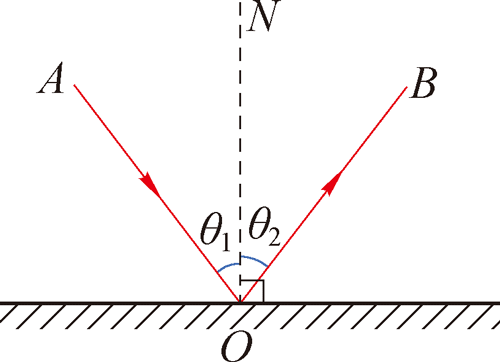 我们可以将光反射时的立体图简化为如图 4–1–10 所示的平面图。入射光线与法线的夹角 θ1 叫做入射角,反射光线与法线的夹角 θ2 叫做反射角。