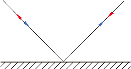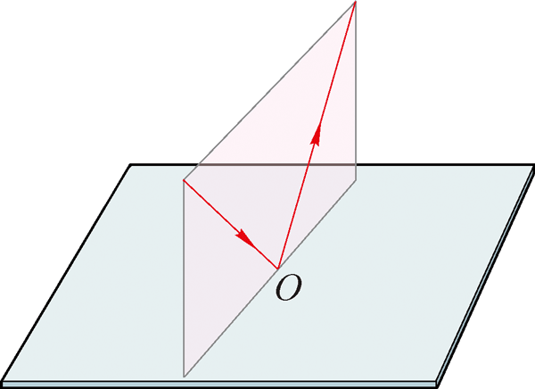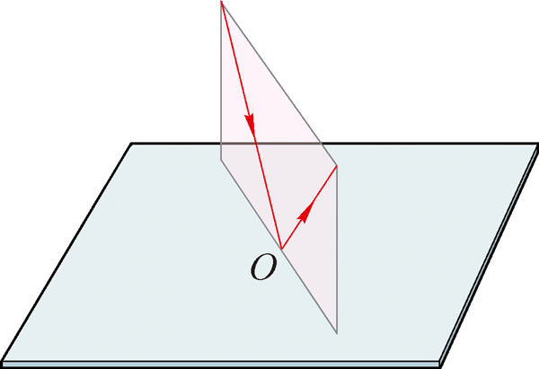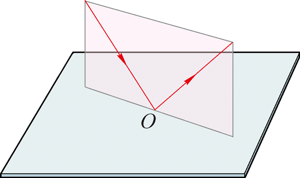 如图 4–1–8 所示,光沿不同方向射向入射点 O,可以找到各入射光线与其对应的反射光线所在的平面。如图 4–1–9 所示,这些平面相交于同一条直线 ON,这条直线过入射点 O 且垂直于镜面,叫做法线(normal line)。实验表明:反射光线在入射光线与法线决定的平面内;反射光线和入射光线分别位于法线的两侧。