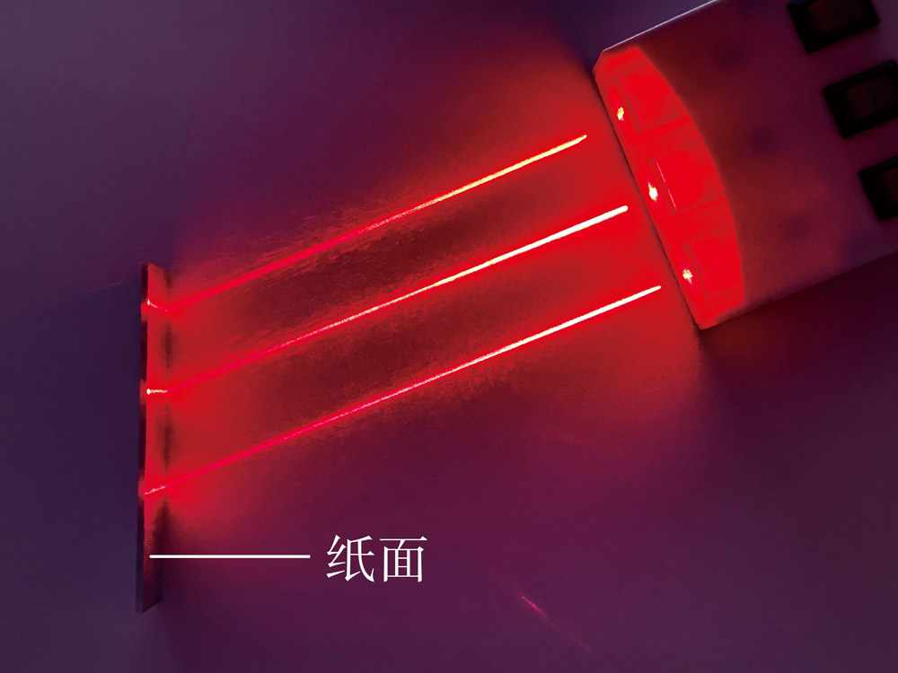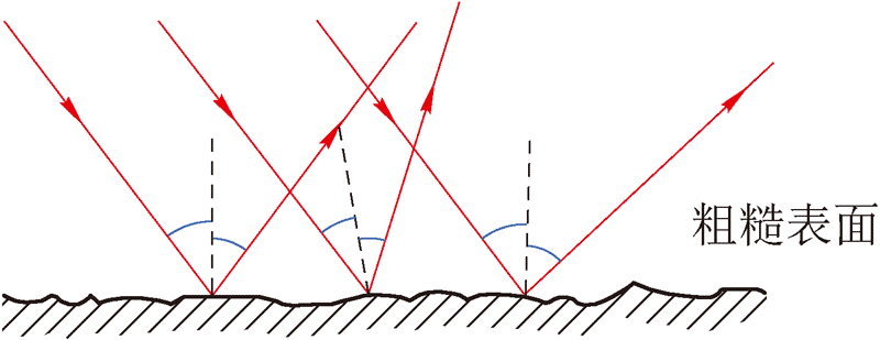如图 4–1–15 所示,将平行的激光束射向纸面,纸面上映出一片红光,无法观察到明显的反射光线。这是因为将看似光滑平整的纸面放到显微镜下,可以观察到它的表面是凹凸不平的。这种凹凸不平的表面可以看成是由大量法线方向不同的小平面组成的。如图 4–1–16