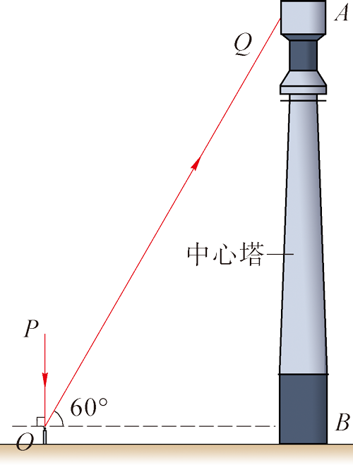 4.图 4–1–20 中,AB 为光热电站的中心塔。利用镜面可将太阳光反射到塔上某处。POQ 为其中一束光线经平面镜反射的路径示意图。试通过作图标出平面镜的位置和入射角的度数。