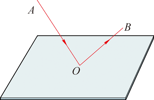 通过一束光斜射向平面镜发生反射的现象可以研究光的反射所遵循的规律。如图 4–1–7 所示,用斜射向平面镜的光线 AO 表示入射光线;O 点表示入射光线在平面镜上的入射点,用光线 OB 表示反射光线。