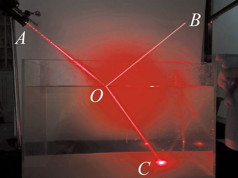 如图 4–3–2所示,玻璃容器中盛有浓盐水,水面上方有烟雾。一束激光从空气斜射向水面,分别从侧面和上方观察激光的传播情况。