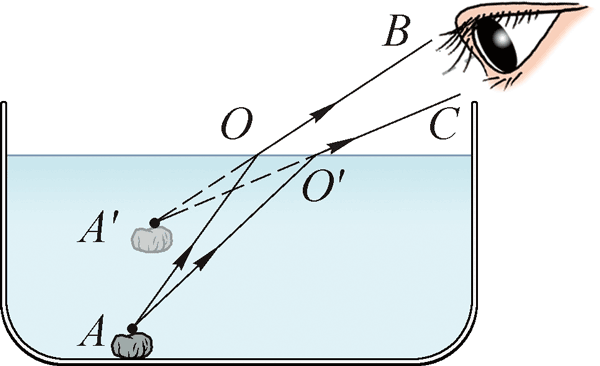 炎炎夏日,清澈见底的山中潭水(图 4–3–5),让人有下水嬉戏的欲望,但千万不要觉得水看起来不深就贸然下水,在潭边上看水的深度总比实际的要浅一些,这是因为光发生了折射。如图 4–3–6 所示,在容器底部有一个石块,它从水下发出的光线 AO 和 AOʹ 在斜射向空气时发生折射,折射光线 OB 和 OʹC 进入人眼时,由于人感觉光是沿着直线传播的,会认为光线是从 OB 与 OʹC 反向延长线的交点 Aʹ 射出的。人看到的石块的像在石块实际位置的上方。图 4–3–1 中的筷子看上去折成两段也是同样的道理所致。