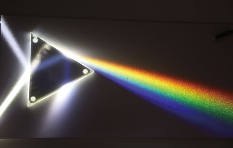 如图 4–3–10 所示,将红色激光斜射至三棱镜的一边,发现红光经过三棱镜折射后,不会发生色