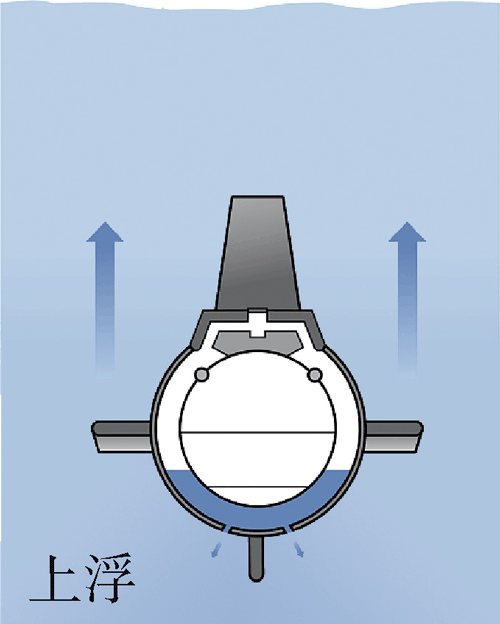 潜水艇的浮潜原理与浮沉子类似。图 7–3–4 是潜水艇的横截面示意图,潜水艇的内舱与外壳之间有一个水舱,水舱通过阀门与外界相连。阀门打开,海水进入水舱,潜水艇所受重力增大,当重力大小大于浮力大