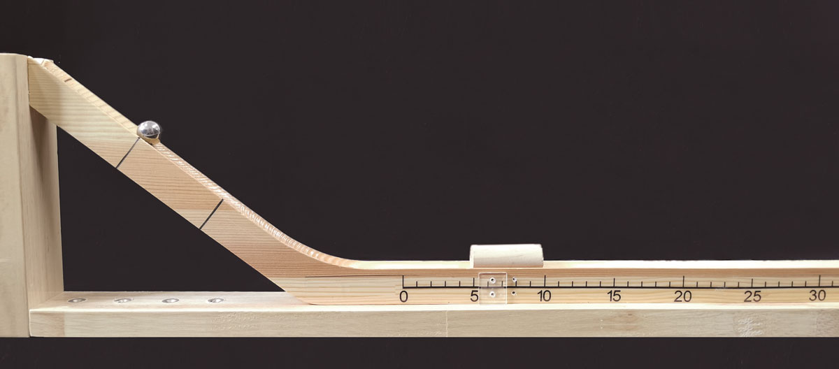 如图 8–4–3 所示,从斜面上向下运动的小球撞击水平面上的木块后,能推动木块沿水平面运动一段距离,小球把木块推得越远,说明小球对木块做的功越多,小球原先具有的动能就越大。
