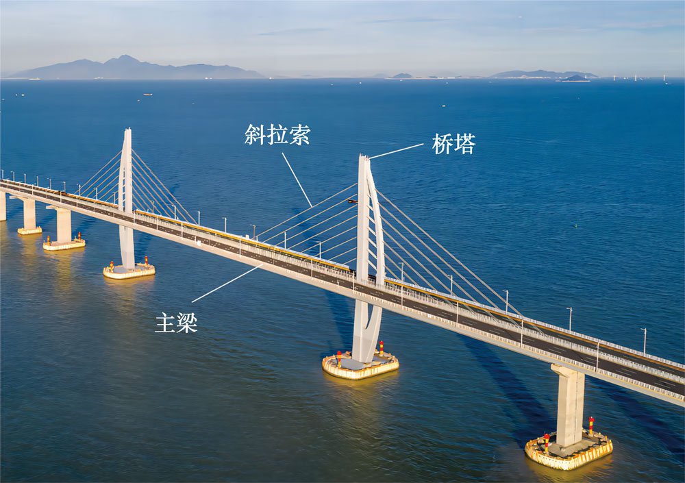 斜拉桥是用许多斜拉索将主梁直接拉在桥塔上的一种桥梁,是大跨度桥梁的主要类型。斜拉桥的主要结构包括主梁、斜拉索和桥塔。图1所示的斜拉索桥是港珠澳大桥的重要组成部分,其桥塔像风帆一样伫立在海中,寓意一帆风顺,与两侧的斜拉索、下面的主梁构成了一道美丽的风景线。