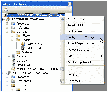 3.右击Solution ‘SOFTIMAGE_XNAViewer’ (4个项目)选择Configuration Manager。