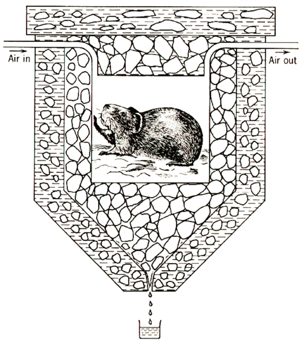 法国的拉瓦锡和拉普拉斯曾经用冰卡计测量物质在化学反应过程中所放出的热量以及物体燃烧或动物呼吸时所散发的热量。他们把燃烧物或待测动物放在冰卡计的内室中,如图 2 – 14 中的豚鼠。然后比较燃烧和动物呼吸所放出的热量与放出的二氧化碳之比,发现这两个比值近似相等。这个结果对能量转化与守恒定律的建立有重要意义,因为它启示了动物热的来源和呼吸的本质,从而为能量转化与守恒提供了不可多得的佐证。德国化学家莫尔(F.Mohr,1806—1879)从许多事例领悟到,不同形式的“力”(即能量)都是机械“力”的表现,他写道: