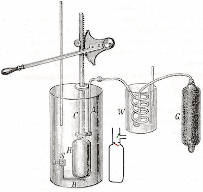 这个现象其实不稀罕,摩擦生热自古尽人皆知。热质说者对这个现象也作了自圆其说的解释,说是因为物体在摩擦时,热质被拉曳,金属屑在从金属块中切削下来时带去了大量热质,因此显得特别热。伦福德爱好思索、喜欢钻研,他从年轻时代起就对热学中的疑难问题十分关心。他亲自做过许多热学实验,早就对热质这一套说法产生了怀疑,为了要从根本上作出判决,他就作了如下几个实验。