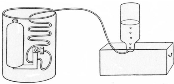 伦福德又做了一个水箱实验。他把圆筒放在一只水箱中,水重 18.77 磅(即 8.5 公斤),让马带动钝钻头在圆筒中旋转,经过 2 个半小时竟使水沸腾了。周围的观众人人都惊讶起来。这么多的水不用火烧,居然能沸腾,真是个奇迹。伦福德自己也简直无法抑制自己的喜悦心情。