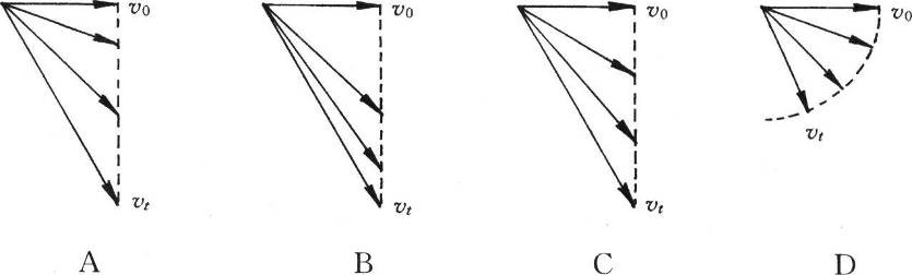 118.水平抛出一个小球,抛出时速度为v0,落地时速度为v1,忽略空气阻力,图中能够正确地表示在三段相等时间内速度矢量的变化情况的是( )