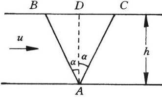 119. 如图所示,河宽为h,水流流速恒定为u,小船在静水中的速度为v。今令小船自A点出发渡河,第一次小船以AB航线渡河,第二次小船沿AC航线渡河,已知AB、AC与河岸垂线间的夹角都为α,则两次渡河所需时间相比( )