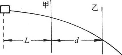 122. 如图所示,一玩具手枪水平射出一颗子弹,在离枪口L处竖直放一薄纸屏甲,在甲后相距d处再竖直放一薄纸屏乙,子弹在纸屏上留下两个弹孔,两弹孔高度差为h,求子弹的初速度。