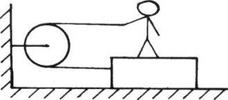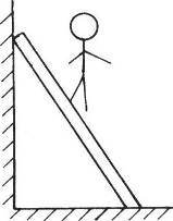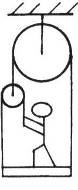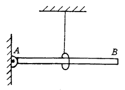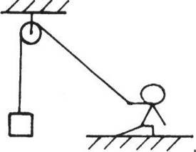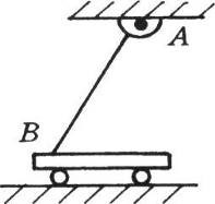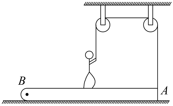 93.质量为 m 的运动员站在质量为 m/2 的均匀长板 AB 的中点,板位于水平地面上,可绕通过 B 点的水平轴转动,板的 A 端系有轻绳,轻绳的另一端绕过两个定滑轮后,握在运动员手中。当运动员用力拉绳时,滑轮两侧的绳都保持在竖直方向,如图所示。要使板的 A 端离开地面,运动员作用于绳的最小拉力是_________。