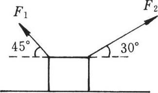 14.如图所示,质量为6 kg的物体放在水平面上,在同一竖直平面内,用大小为20\(\sqrt 2 \)N、方向与水平面成45°角的F1和大小为40 N、方向与水平面成30°角的F2两个力提它,物体仍静止不动,物体除了受F1、F2作用外,还受到_______________的作用,它们的大小分别是________N、________N和_________N。