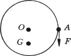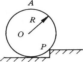 97.如图所示,在半径为R的轮边缘最高点A处用力F使轮滚上台阶,轮与台阶的接触点为P,要使力F最小,则力F的方向应是______,在使轮滚动过程中,力F的力矩是______(填“顺时针”或“逆时针”)的。若轮的质量为M,台阶高为h=\(\frac{R}{2}\),则F的大小至少为_____。