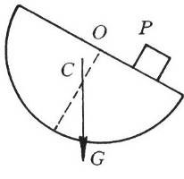 113.如图所示,一个半径为R、重为G的匀质半球体,放在地面上,其重心位置在球心O下的C点,OC=\(\frac{3}{8}\)R。现在半球体上表面的平面上放一重为\(\frac{G}{4}\)的小物体P,已知小物体与半球体的平面间的滑动摩擦系数μ=0.2,则要保证半球体倾斜后小物体不滑下,小物体的位置离开半球体球心的最大距离为______。