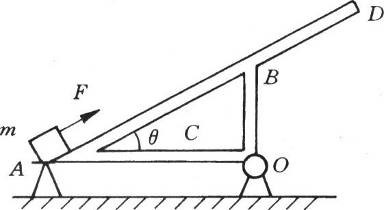 128.如图所示,AOB为三角支架,质量M=19.2 kg,A端搁在铁块上,支架可绕过O点的水平轴自由转动,支架重心在C点,C点距O点的水平距离d=0.2 m,AO=L=0.8 m,支架的斜面AD的倾角θ=37°。质量m=10 kg的物体放在支架底端A处,物体在平行于AD方向的力F作用下由静止开始运动,F=85 N,物体与AD间的滑动摩擦系数μ=0.25,求: