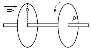 23.如图所示,同轴的两个薄纸圆盘,相距为L,以角速度ω匀速转动,一颗子弹从左边平行于轴射向圆盘,在两盘上留下两个弹孔,两弹孔与盘心的连线间的夹角为60°,试确定子弹速度的可能值及最大值。