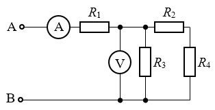221.如图所示电路中,电阻R1=3.5 Ω,R2=R3=10 Ω,R4=5 Ω,电源电动势为30 V,内电阻为0.5 Ω,求外电路总电阻和R1两端的电压。