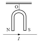 10.如图所示,蹄形磁铁用悬线悬于O点,在磁铁正下方固定一水平放置的长直导线,当导线中通以自左向右的电流时,蹄形磁铁发生的运动将是垂直纸面向外还是向里偏转( )