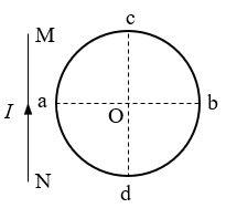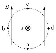 29.如图所示,在一方向竖直向上的匀强磁场中,沿水平方向放置一长直通电导线,导线中的电流方向垂直纸面向里,a、b、c、d是以通电导线为圆心的同一圆周上最高、最低、最左和最右的四点,则在这四点中有( )。