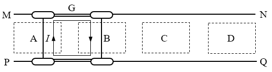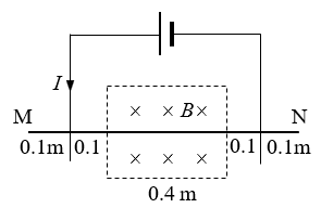 86.如图所示,磁场区域的宽为0.4 m,两平行导电导轨的间距为0.6 m,导体棒MN的长为0.8 m,磁感应强度为B=0.5 T,电源输出的电流大小为I=2 A,则导体棒MN所受的磁场力大小为( )。
