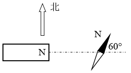 66.如图所示为利用地磁场来估测距磁体的磁极较远的地方的磁感应强度的实验装置,条形磁铁沿东西向放置,N极向东,实验中得到的小磁针N极的指向如图,与正东方向的夹角为60°,通常地磁场在水平面上的分量为5×10-5 T,则该条形磁铁在图示位置的磁感应强度为多大?