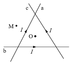 75.如图所示,在同一平面内有三根长直导线a、b、c,构成一个正三角形,通以大小相等、方向如图所示的电流,测得正三角形中点O处的磁感应强度为B1。关于导线a与O点对称的M点的磁感应强度为B2,则撤去导线a后,M点的磁感应强度大小为_______,方向_______。