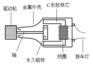20.如图所示为自行车发电机的结构示意图,它有一块永久磁铁,置于绕有线圈的C形软铁芯内。当自行车车轮转动时,通过摩擦带动磁铁转动,关于它发电的原理,下列说法中正确的是( )。