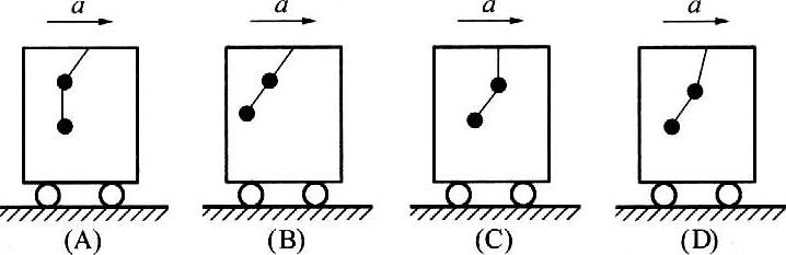 (D)小车向左以加速度a运动时,F=\(\sqrt {{{(ma)}^2} + {{(mg)}^2}} \),方向斜向左上方,与竖直方向的夹角为α=arctan\(\frac{a}{g}\)